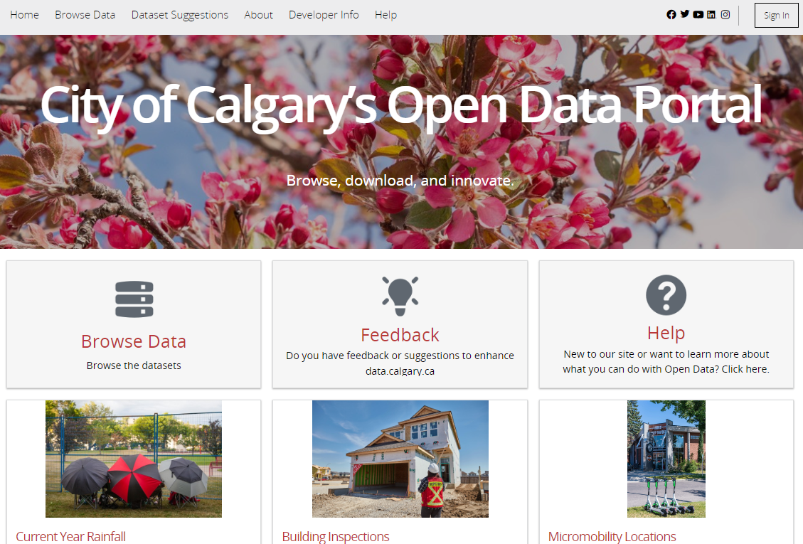 What’s really interesting about looking at open data is that, since those data are stored in databases, they both require someone to categorize the data, and they also record their own histories. Social scientists have long asked questions about how to study communities through digital technologies like chat rooms, social media platforms, and email listservs, but so far they have focused mostly on the communities rather than the ways the technologies mediate those communication channels. In our paper, we combine these insights to look at an open database as a mediator of politics around meaning and power. What we mean by this is that, whereas ethnographers used to drop into communities and observe their social interactions over a long period of time, we propose that social scientists can do the same thing for the open database. By observing how the database is organized and structured, as well as how it changes over time, we can glean some interesting insights into the unevenness and complexities of open data within cities. We sketch out the idea of a database ethnography as a way of systematically, rigorously, and scientifically examining the variety of political and social impacts open data have on a city. We tested this methodology in the city of Calgary, Alberta, a city that’s scrambling to expand its open data offerings to catch up with some nearby open data leaders like the city of Edmonton. Calgary’s open data platform is named Open Calgary.