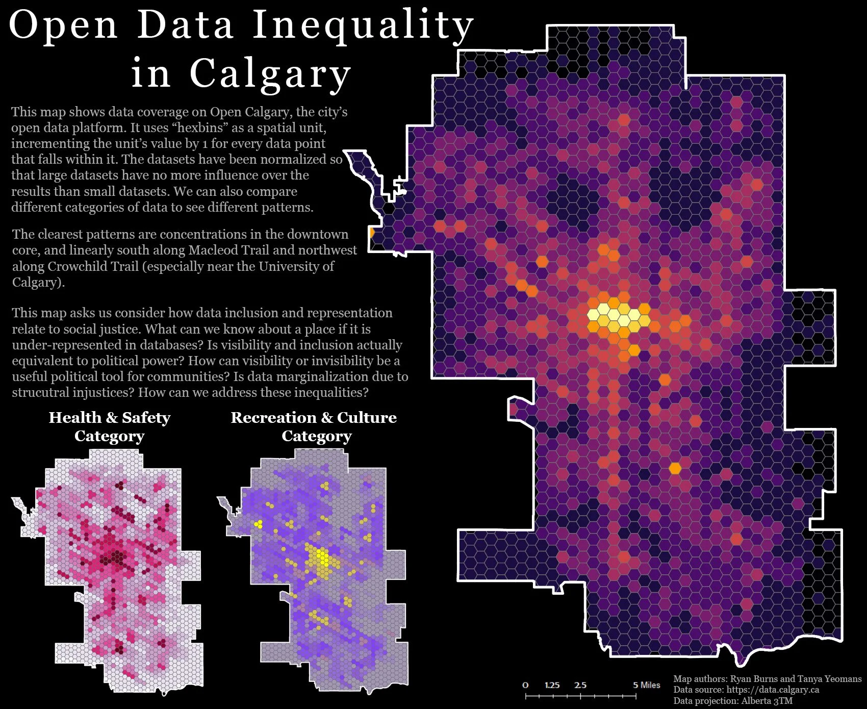 After our article was published, we were able to expand our analyses cartographically, to visualize the uneven coverage of Open Calgary. We were interested in what parts of the city of Calgary are represented in Open Calgary, and what those representations look like. Again, as part of our database ethnography, we generated a hexagonal lattice grid over the city, and on the most basic level, added up all the open data points that fall within each cell of the grid. We gave the resulting numbers a color ramp to indicate which areas of the city are more represented than others. This basic analysis faces a number of really trenchant limitations, so we have been experimenting with other ways of doing the math. We’ve normalized the datasets so that larger ones don’t disproportionately influence the outcomes; we’ve visualized by category; and we’ve begun to segment out datasets of similar temporal qualities like real-time waste management datasets versus demographic information. These analyses are in the very early stages and we have a lot of work to do before they’re scientifically sound, but we are excited to see where it takes us. At this stage, it seems to us that it will mobilize the database ethnography to generate even more insights into the remarkably uneven, unexpected, and under-acknowledged implications of open data.